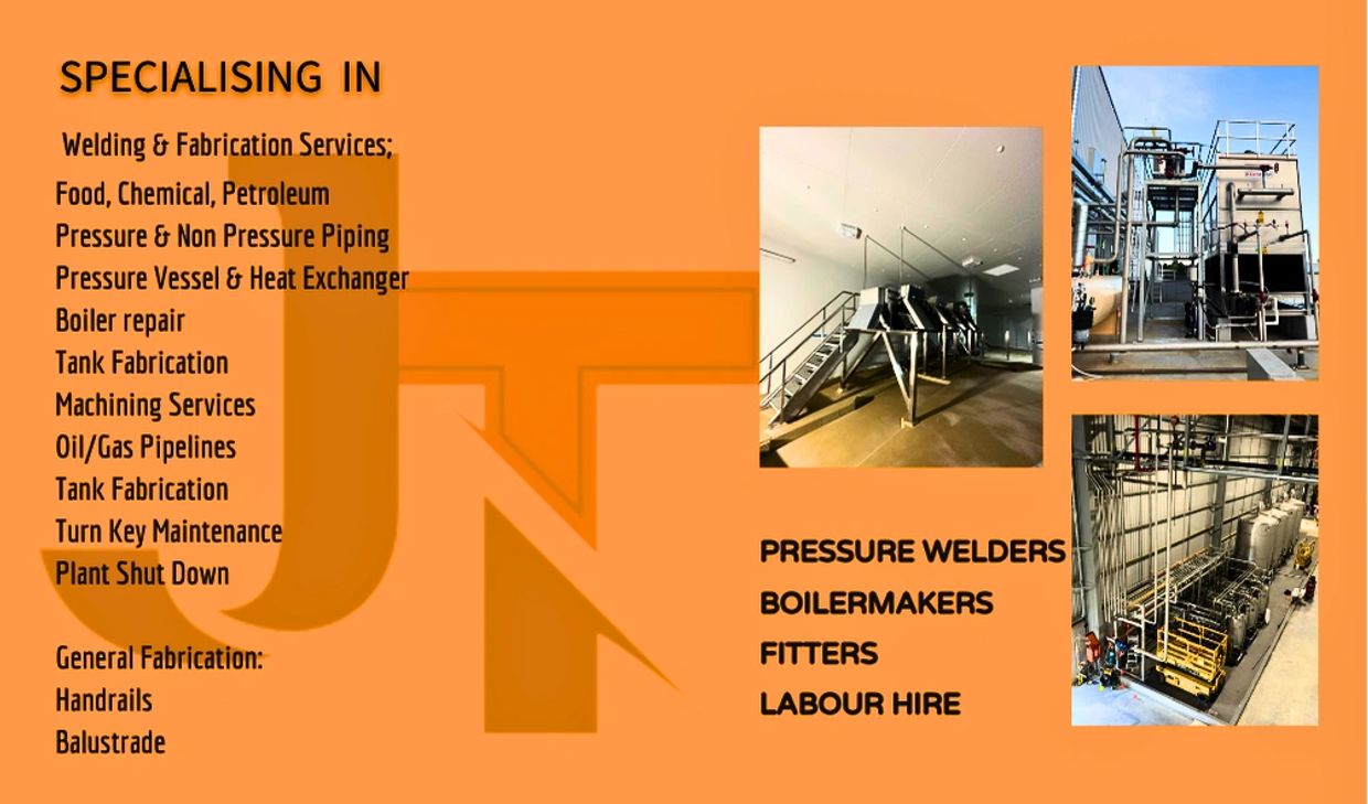 At JT Pipe & Steel Fabrication, we offer high-quality welding solutions for stainless steel, carbon steel, and aluminium with extensive experience across food processing, oil & gas, and industrial sectors, we deliver reliable and precise fabrication and repair services tailored to meet industry standards and client needs. Whether it’s a new project or maintenance work, you can count on durable workmanship and attention to detail every step of the way.